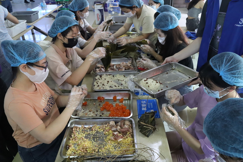 饭堂工作人员拿出提前精心准备好的粽叶、糯米、红豆、蛋黄、花肉等材料,并指导老师和同学们制作节日粽子。师生握粽叶、放馅料、绑粽绳,乐在其中。期间校学生会组织大家围绕端午节开展了趣味知识问答,同学们认真聆听问题,踊跃抢答,从端午节的由来传说到“喝雄黄酒”“赛龙舟”等端午传统活动的意义,再到讲述自己家乡的端午特色民俗,现场欢声笑语一片。