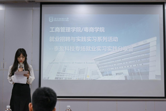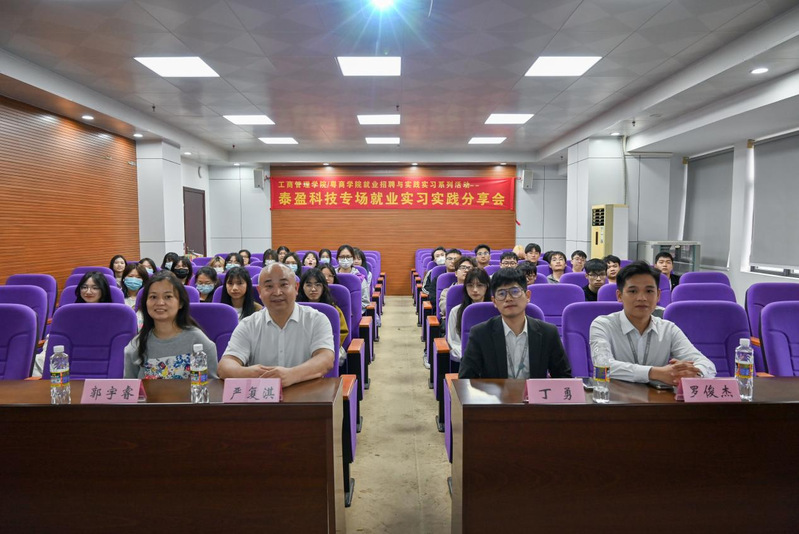 4月25日下午,工商管理学院/粤商学院在北二445学术报告厅开展泰盈科技就业实习实践分享会,党委副书记严复淇、辅导员兼团委书记郭宇睿及19级毕业班、21级等60余名学生到会参与。