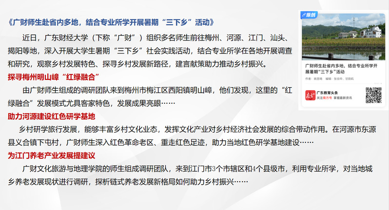 2023年7月22日,校团委组织各社会实践项目负责人、宣传工作负责人开展了三下乡”社会实践暨青年大学生“百千万工程”突击队新闻媒体报道专题培训。活动邀请了专业的新闻媒体从业人员——《南方日报》记者姚昱旸,以“如何讲好融媒时代的校园故事”为主题,指导各团队学习如何撰写社会实践报道,内容包括新闻撰写规范与要求、新闻稿写作的基础知识、新闻导语、常用词语、“三下乡”新闻稿的注意事项等方面,记者姚昱旸还通过案例展示,引导同学们结合专业特色,从新闻视角、新闻内容、新闻图片等多角度指导写好一篇新闻稿。通过本次专业培训,有助于各团队更好地进行暑期“三下乡”社会实践活动的宣传工作,进一步扩大社会实践的影响力。