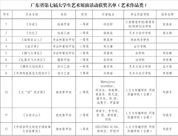 近日,广东省第七届大学生艺术展演活动获奖结果揭晓。我校获一等奖6项、二等奖6项、三等奖1项,学校荣获“优秀组织奖”。艺术表演类集体朗诵乙组(专业组)一等奖作品《时间的入口》(推荐单位:湾区影视产业学院,指导老师:郭丽莉)和艺术作品类绘画甲组一等奖作品《丰收》(推荐单位:工商管理学院/粤商学院/创新创业学院,指导老师:安海波)获推荐至教育部参加全国第七届大学生艺术展演活动。