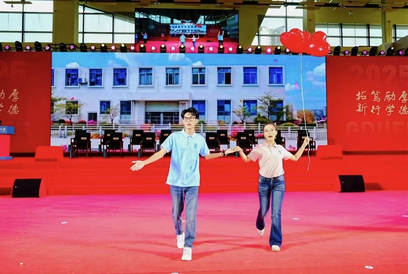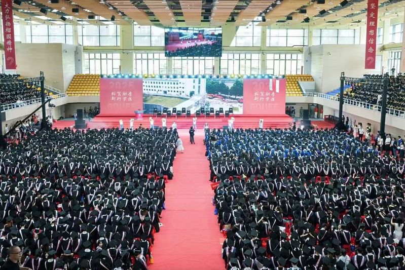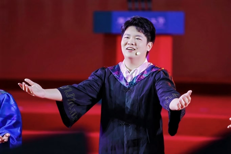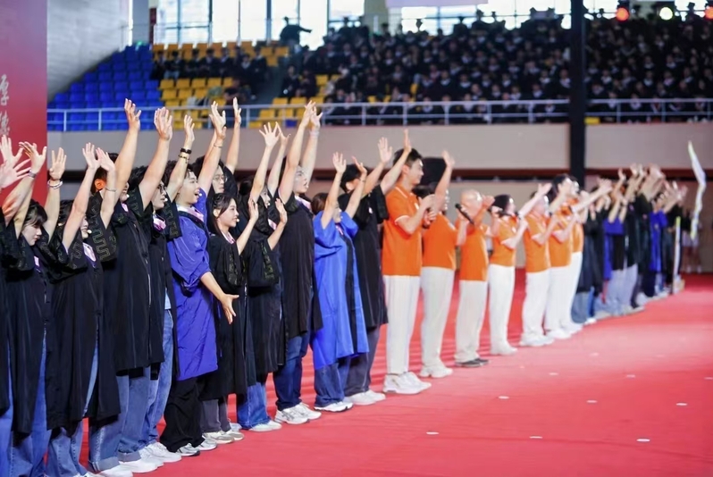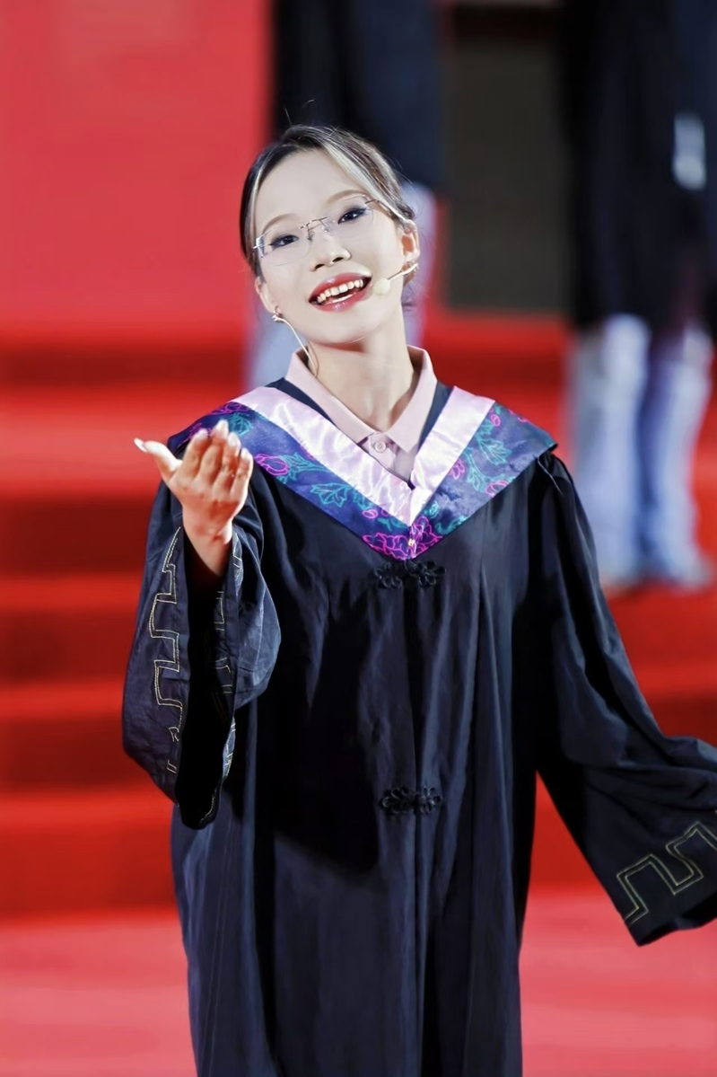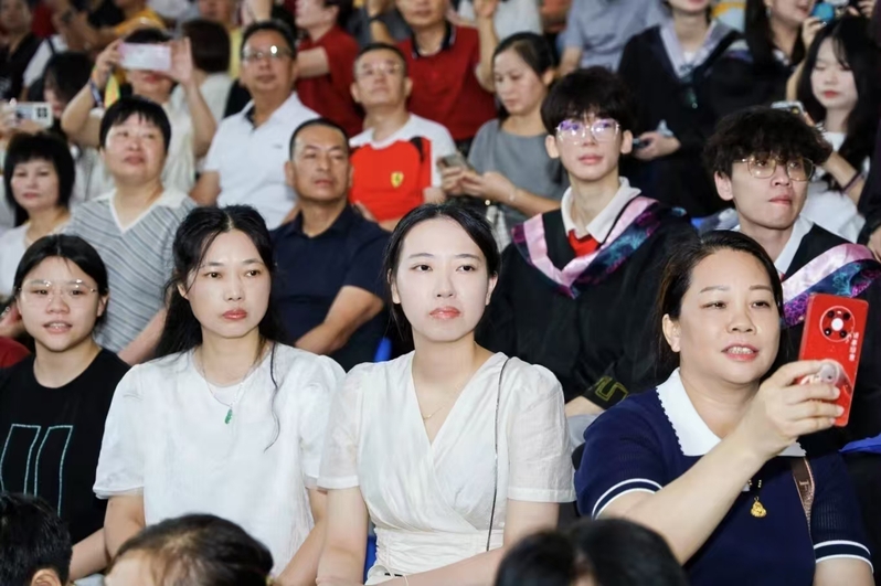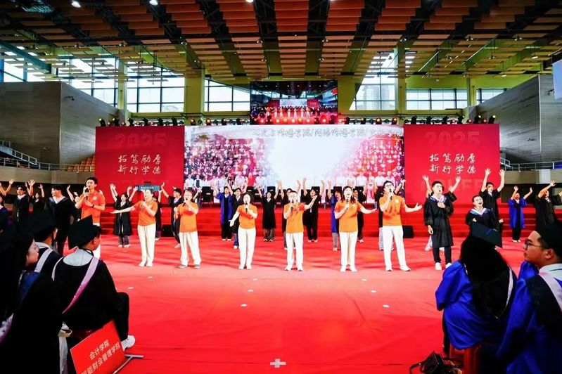 终章“毕业”在深情中蓄满力量。当学子穿上学士服,他们互整衣冠、笑谈收获offer的喜讯......《凤凰花开的路口》交织着《我的未来不是梦》的激昂旋律响起,学子们跃动的手势与奔跑的身影化作奔腾的浪潮,最终汇成震撼宣言:“我们是广财25届毕业生,我们都是广财人!”全场毕业生随之齐声呼应,声浪直抵穹顶。