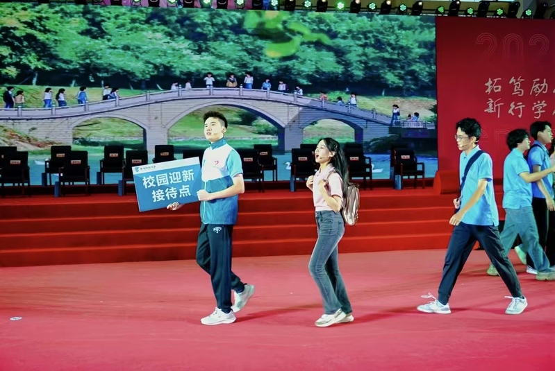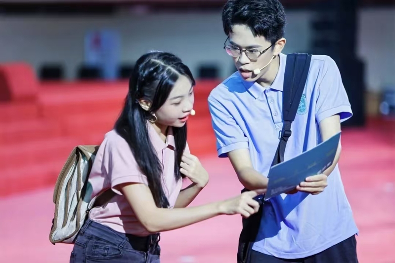 这部毕业音乐剧突破传统暖场形式,通过三幕情景剧,巧妙地串联起2021级学子四年大学时光,呈现出学子们从青涩入校到满载收获的成长轨迹。序幕“遇见”从williamhill威廉希尔官网广佛两校区新生的隔空对话中徐徐展开——“仑头路21号!”“学海中路1号!”。新生们拖着行李箱在《大梦想家》的节奏中探索校园,一句粤语赞叹“我哋学校好犀利”道出无限骄傲。当“三号线”天桥、财源瀑布、钟楼、新研究生公寓等校园地标在歌词中闪现时,毕业生的共同记忆被唤起,观众席响起阵阵的掌声与欢呼。